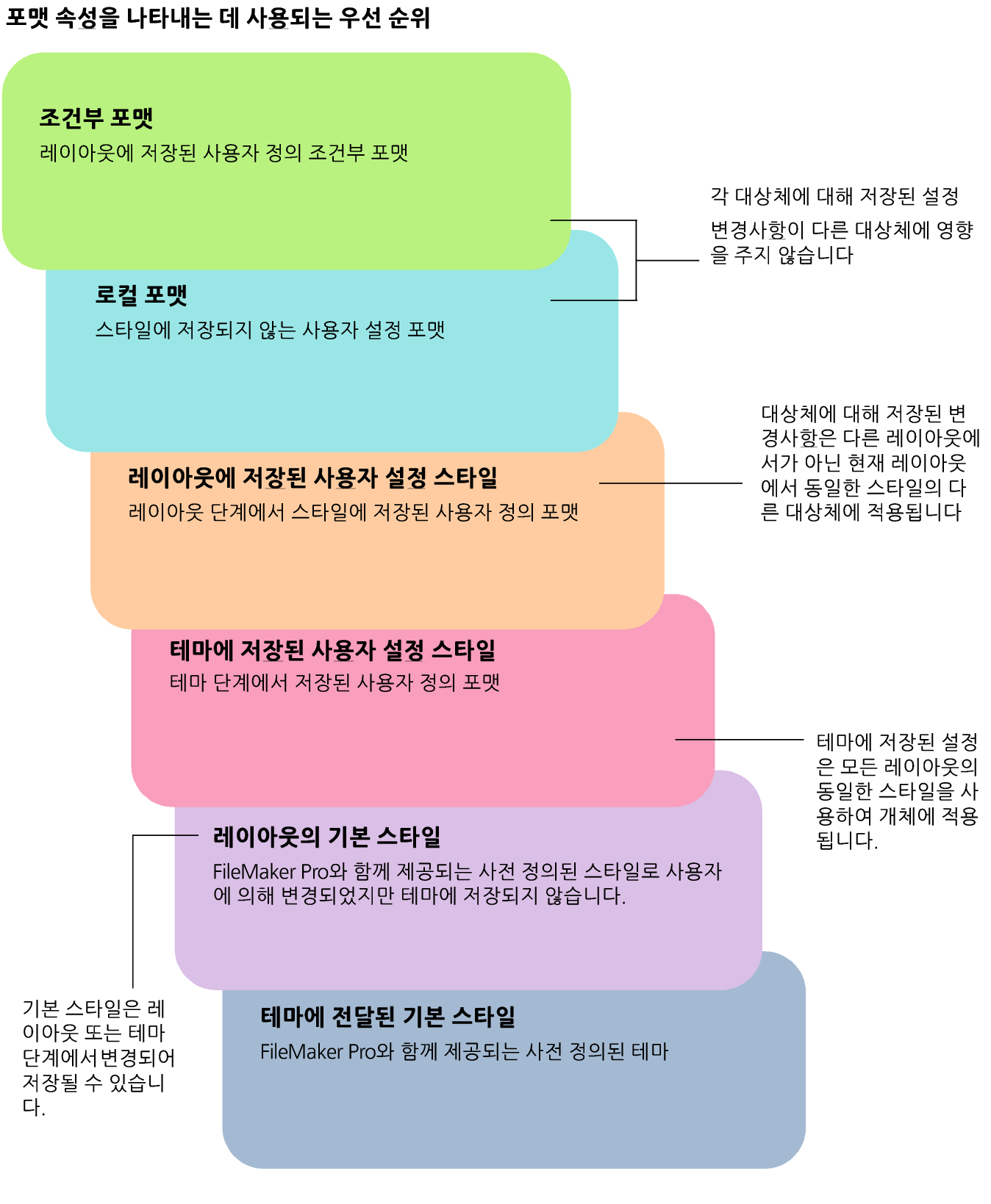 FileMaker Pro가 포맷 속성을 표시하는 방법 대상체, 레이아웃 대상체 또는 레이아웃 배경에 대한 보기 속성을 변경할 때 FileMaker Pro는 정의된 계층 또는 우선 순위에 따라 포맷을 표시합니다. 포맷 속성이 표시하는지를 결정하는 한 가지 요인은 레이아웃 단계에서 또는 테마 단계에서 변경사항을 저장하는지의 여부입니다. 다음 그림은 포맷 변경사항이 표시되는 우선 순위의 순서를 보여줍니다. 관련 주제 레이아웃 대상체의 조건부 포맷 정의하기 레이아웃 대상체, 부분 및 레이아웃 배경에 대한 스타일 생성 및 작업하기 레이아웃 테마 저장 및 관리하기