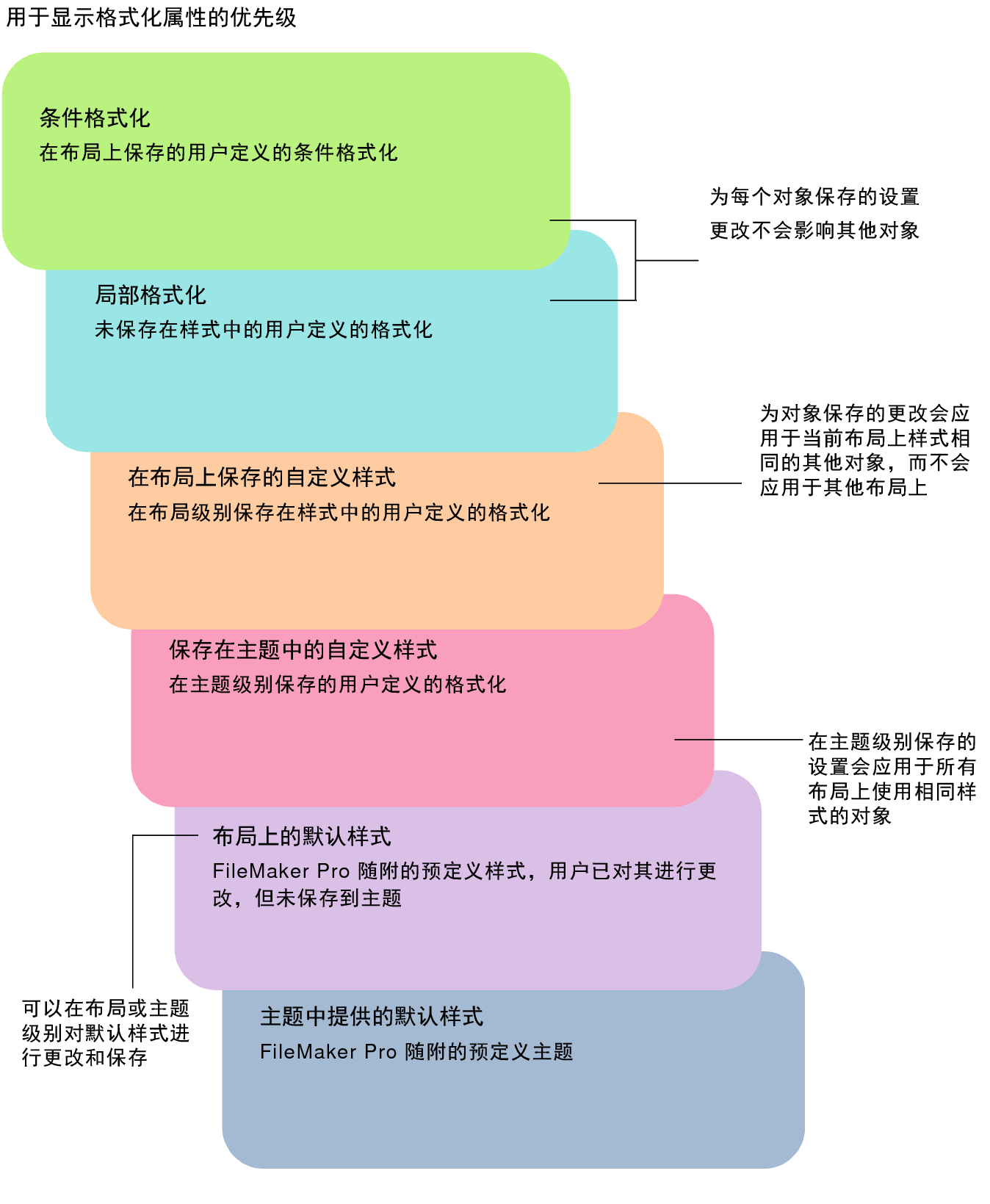 FileMaker Pro 如何显示格式化属性 如果更改对象、布局部分或布局背景的显示属性,FileMaker Pro 会根据定义的层次或优先顺序来显示格式。决定是否显示格式属性的一个因素是您将更改保存在布局级别还是主题级别。下图显示了格式化更改显示的优先顺序。 相关主题 定义布局对象的条件格式化 创建和使用布局对象、部分和布局背景的样式 保存和管理布局主题