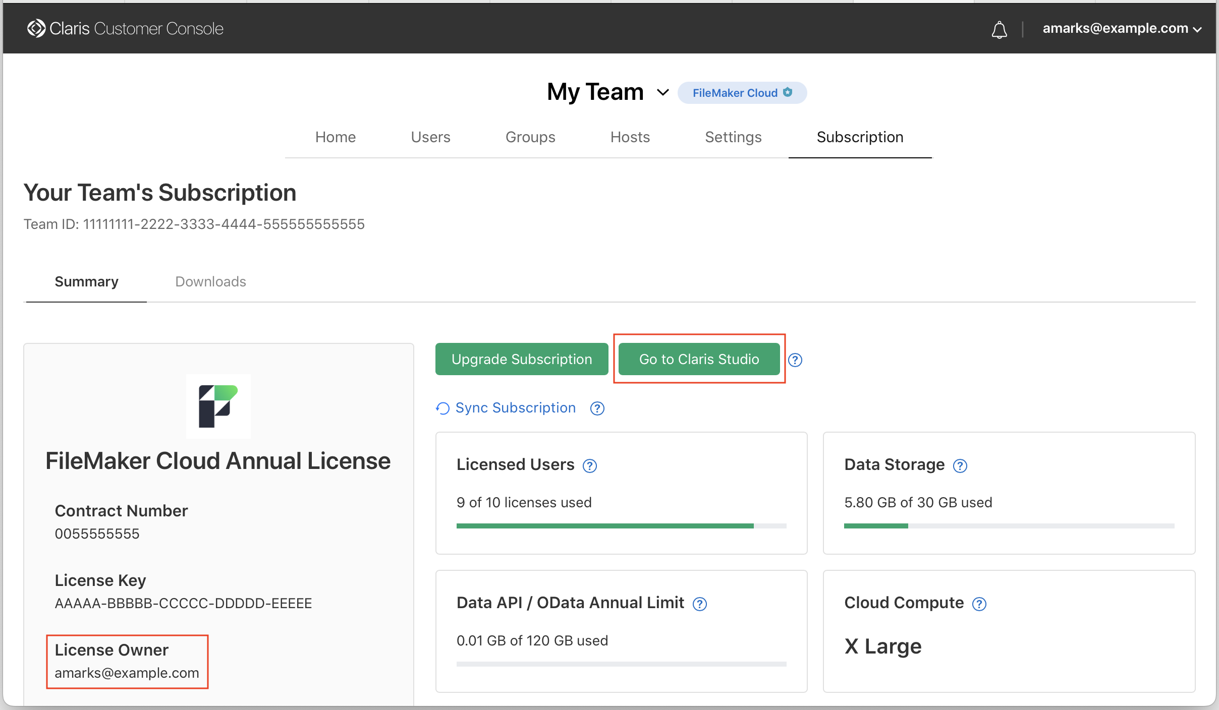 In Claris Customer Console, click the Subscription tab.