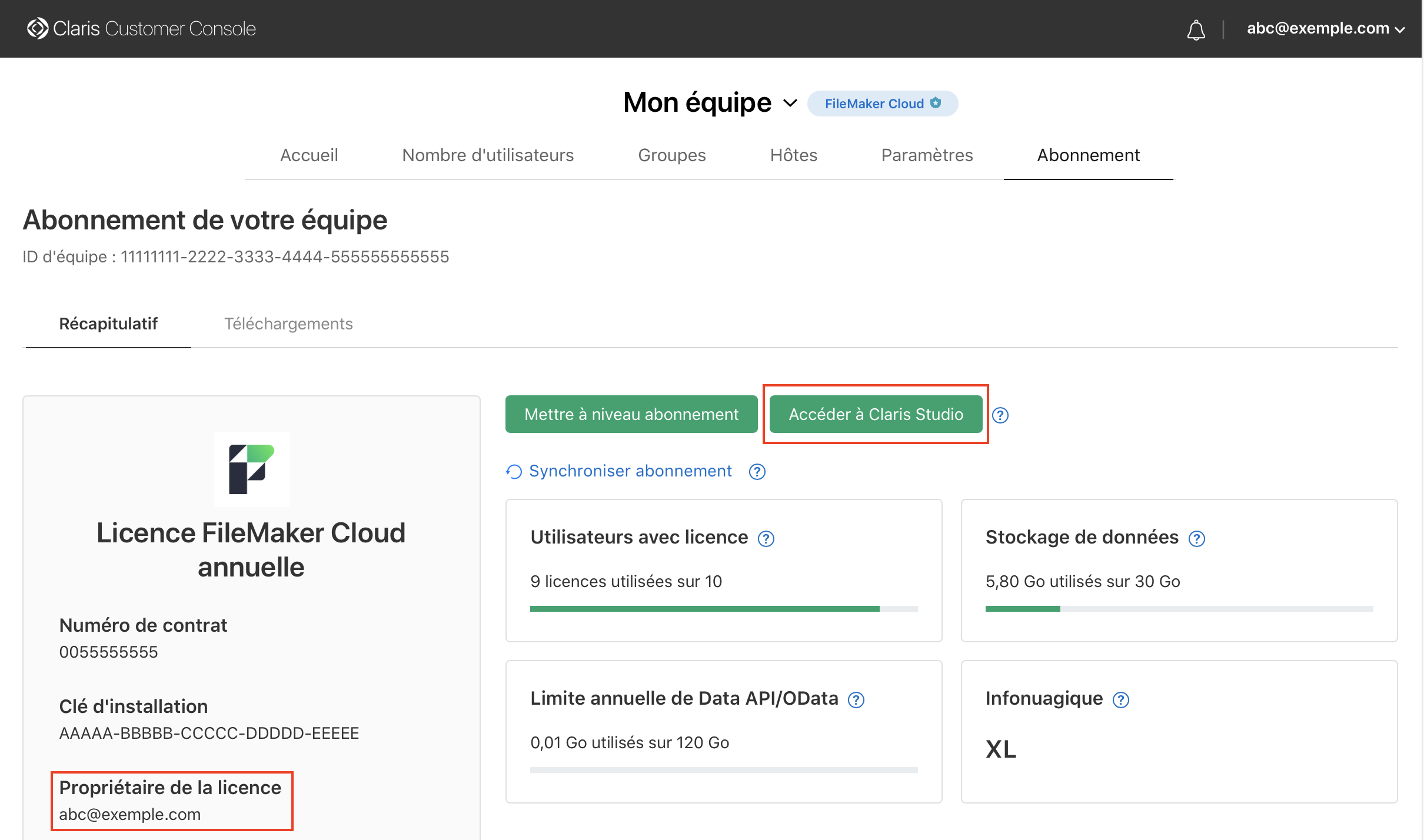 Dans la Claris Customer Console, cliquez sur l'onglet Abonnement.