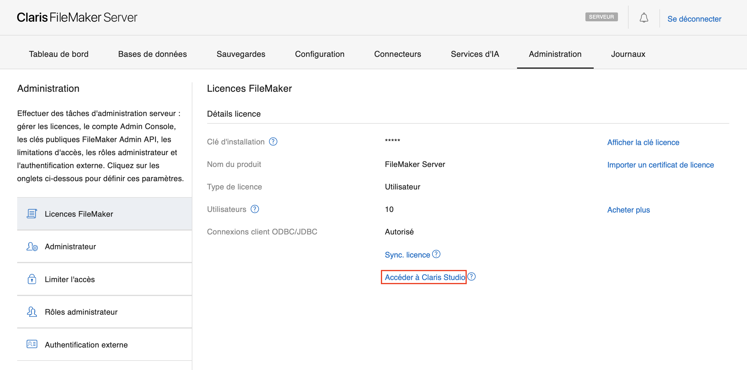 Cliquez sur Accéder à Claris Studio. Ce lien est uniquement disponible pour le propriétaire de la licence.