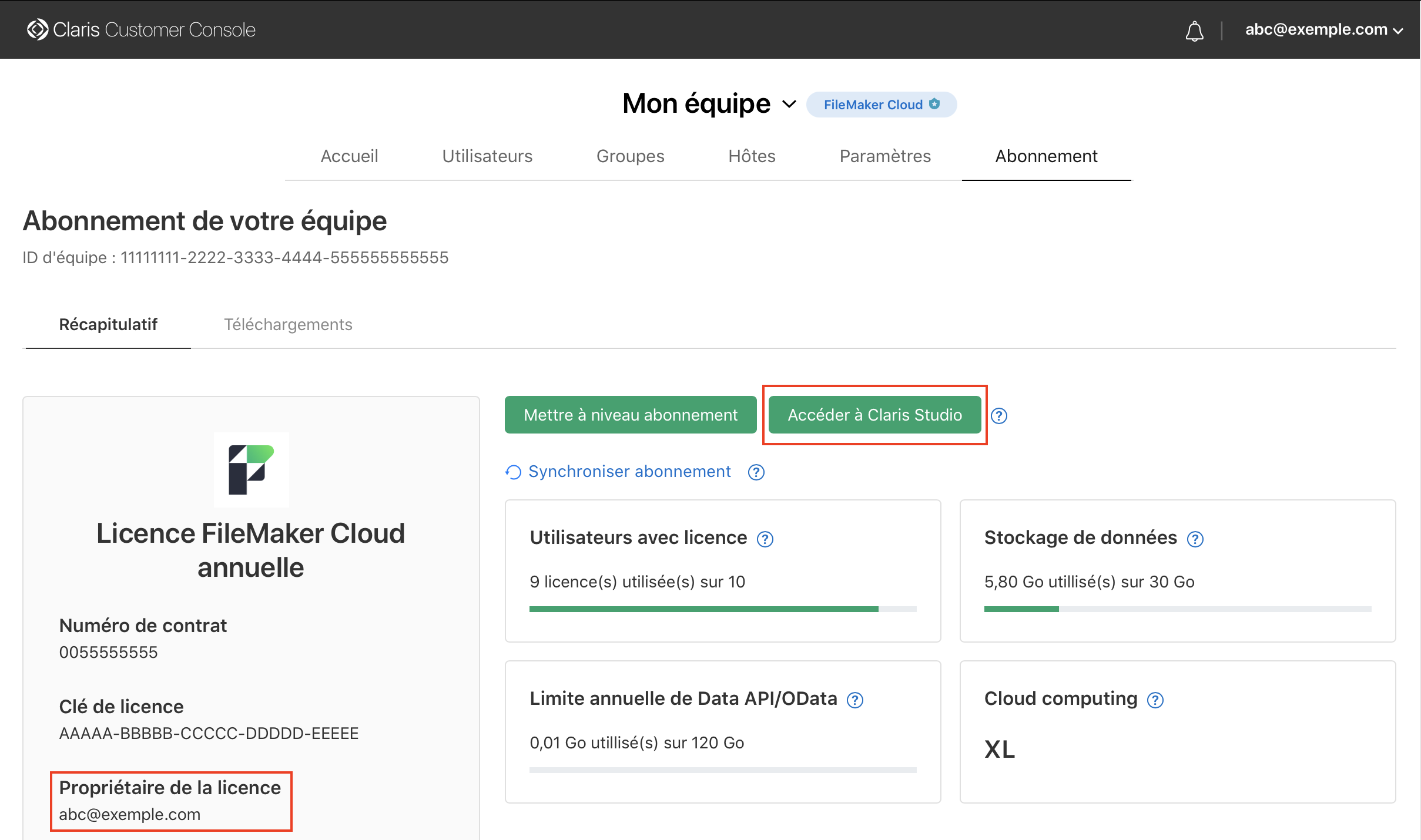 Emplacement du lien Accéder à Claris Studio et adresse e-mail du propriétaire de la licence sur la page Abonnement de la Claris Customer Console