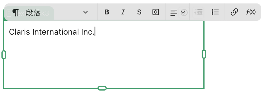 テキストブロックオブジェクトアイコン (正方形の中の T 文字) テキストブロックオブジェクトを使用すると静的なリッチテキストの作成や計算を使用した内容の設定ができるようになります。ユーザは入力することはできずテーブルに関連付けられていないためリッチテキストフィールドとは異なります。
